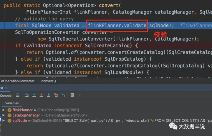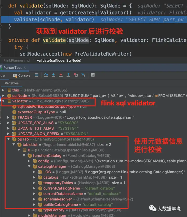 - SqlNode 验证阶段:calcite validator 校验(SqlNode -> SqlNode,语法、表达式、表信息)