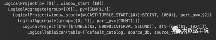 - 关系代数到 datastream 算子的映射:sql 逻辑解析为 datastream,需要有一个解析的映射逻辑吧。sql 是基于关系代数的,可以维护一个 sql 中的每个关系代数到具体 datastream 接口的映射关系,有了这些映射关系我们就可以将 sql 映射成一段可执行的 datastream 代码。举个例子:其可以将: