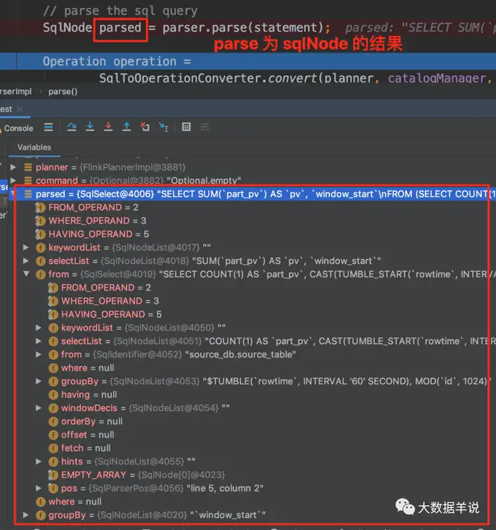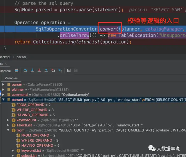 - sql 解析阶段:calcite parser 解析(sql -> AST,AST 即 SqlNode Tree)