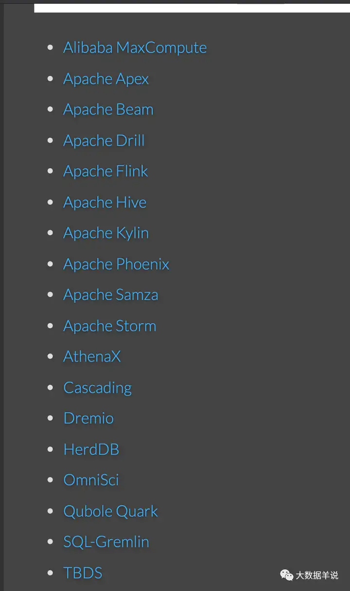 下图是目前使用了 calcite 能力的其他组件,也可见官网 https://calcite.apache.org/docs/powered_by.html 。