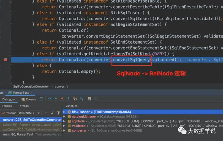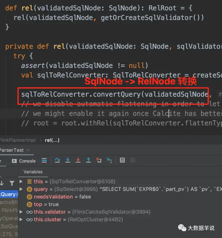 - 语义分析阶段:SqlNode 转换为 RelNode,RelNode 即 Logical Plan(SqlNode -> RelNode)