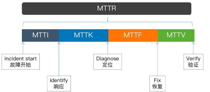 因为我们上面提到过,稳定性建设的两个关键要点: 增加 MTBF,缩小 MTTR。MTTR(故障平均恢复时间)就是指从故障发生开始,到业务恢复的这段时间,我们对 MTTR 其进行拆解,得到如下几个时间段:MTTR = MTTI + MTTK + MTTF + MTTV。