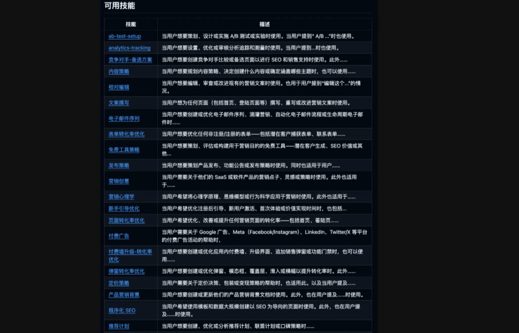 比如说 page-cro 这个 skill:当你想让 Claude 帮你优化落地页的转化率时,会自动应用各种转化率优化的框架和最佳实践。