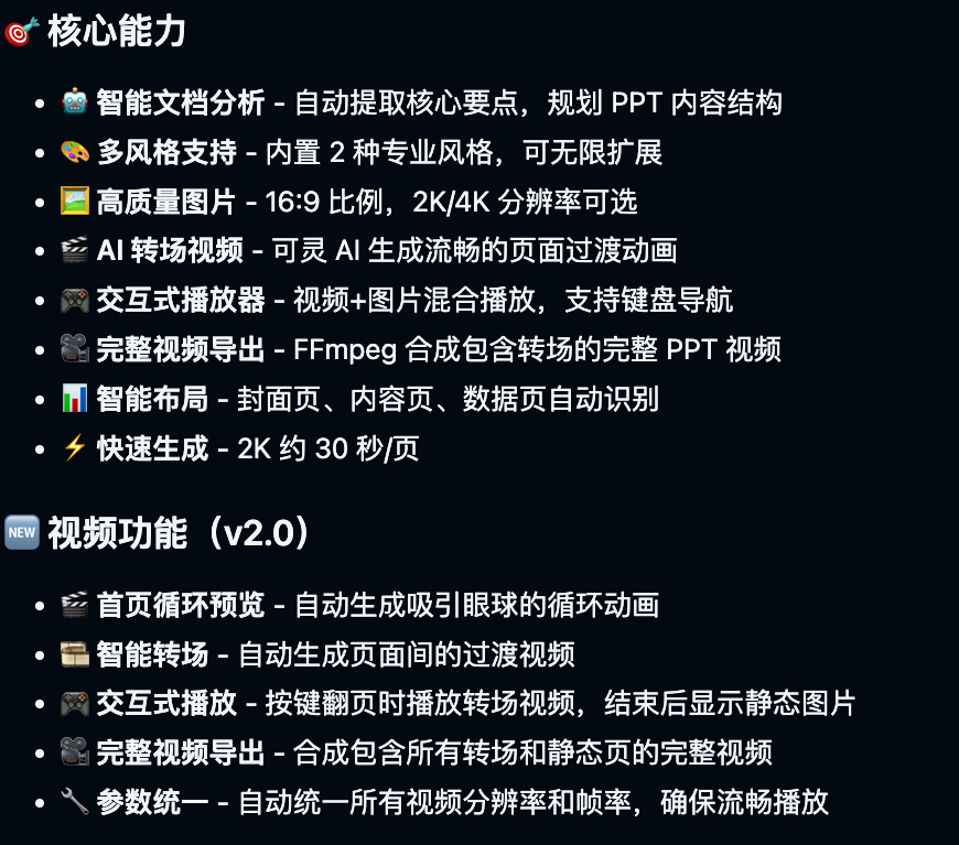 用起来也很简单,你只需要准备一个内容规划文件,告诉它每页要展示什么内容,然后运行一个命令,它就能帮你把整个 PPT 生成出来。